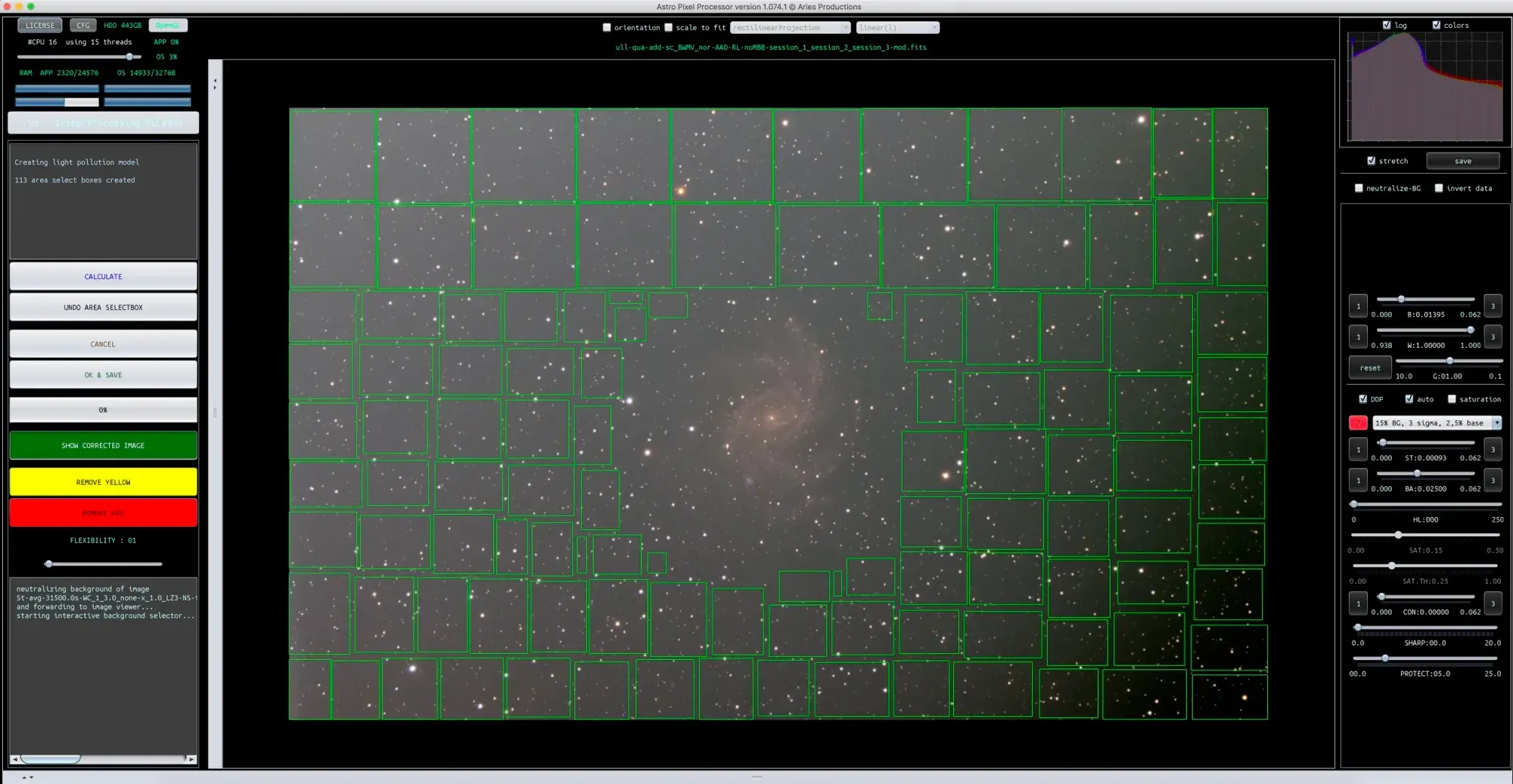 Your final selection should look something like the image above. When you feel you’ve covered all the light pollution, you can press the calculate button. This will show the image with the light pollution removed. If you’re happy with the results, press the OK & Save button. Again, APP makes you create a new file with the light pollution removed.