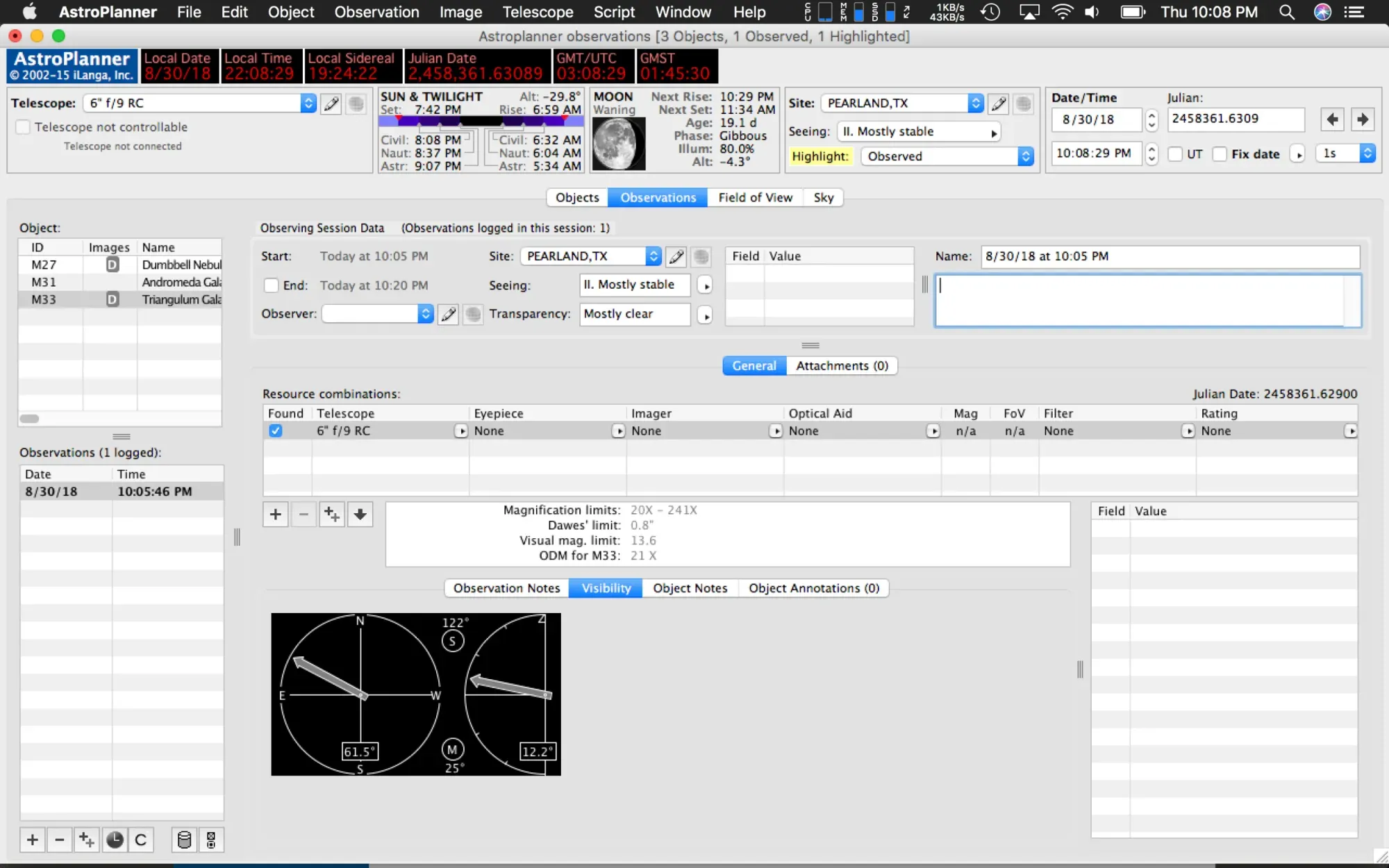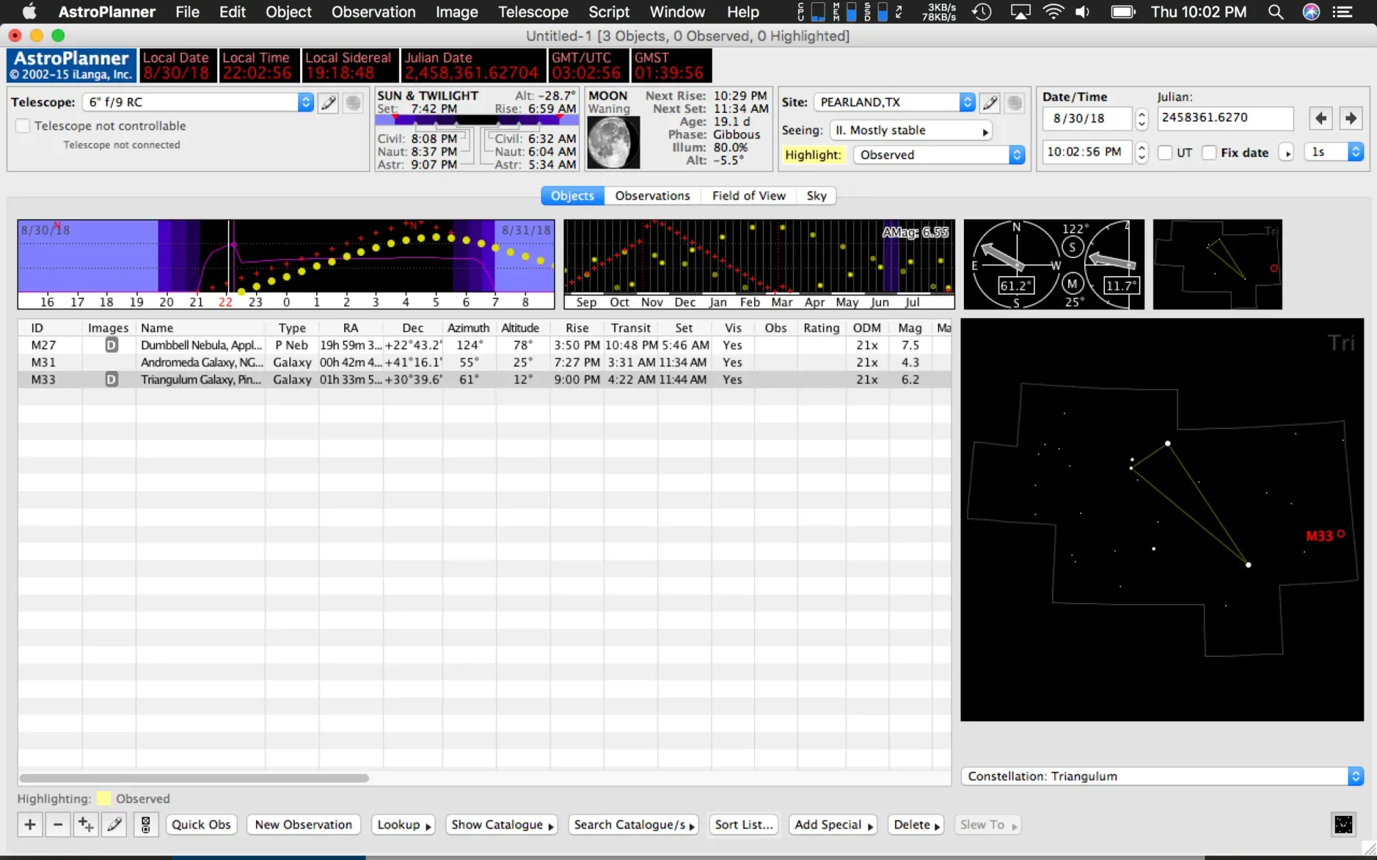 This is the main view within AstroPlanner. From here you add objects by using the Plus symbol in the lower left corner fo the screen. You get a search function to find the object and add it to the list. You an also browse by what is visible currently in the sky, and filter those choices by object type (open cluster, galaxy, nebula, planetary nebula, etc.). Across the top of your screen, you get a readout for the current date and time, sidereal time, Julian date, GMT, and GMST. On the second row below that information you can select the telescope you intend to view your object with. Next to that, you can see the sun and twilight time, what the current moon looks like, as it's helpful to know how much of an impact the brightness of the moon will have with imaging. Then next to that is your site location, and a clock which you can set to show the object at different time intervals.