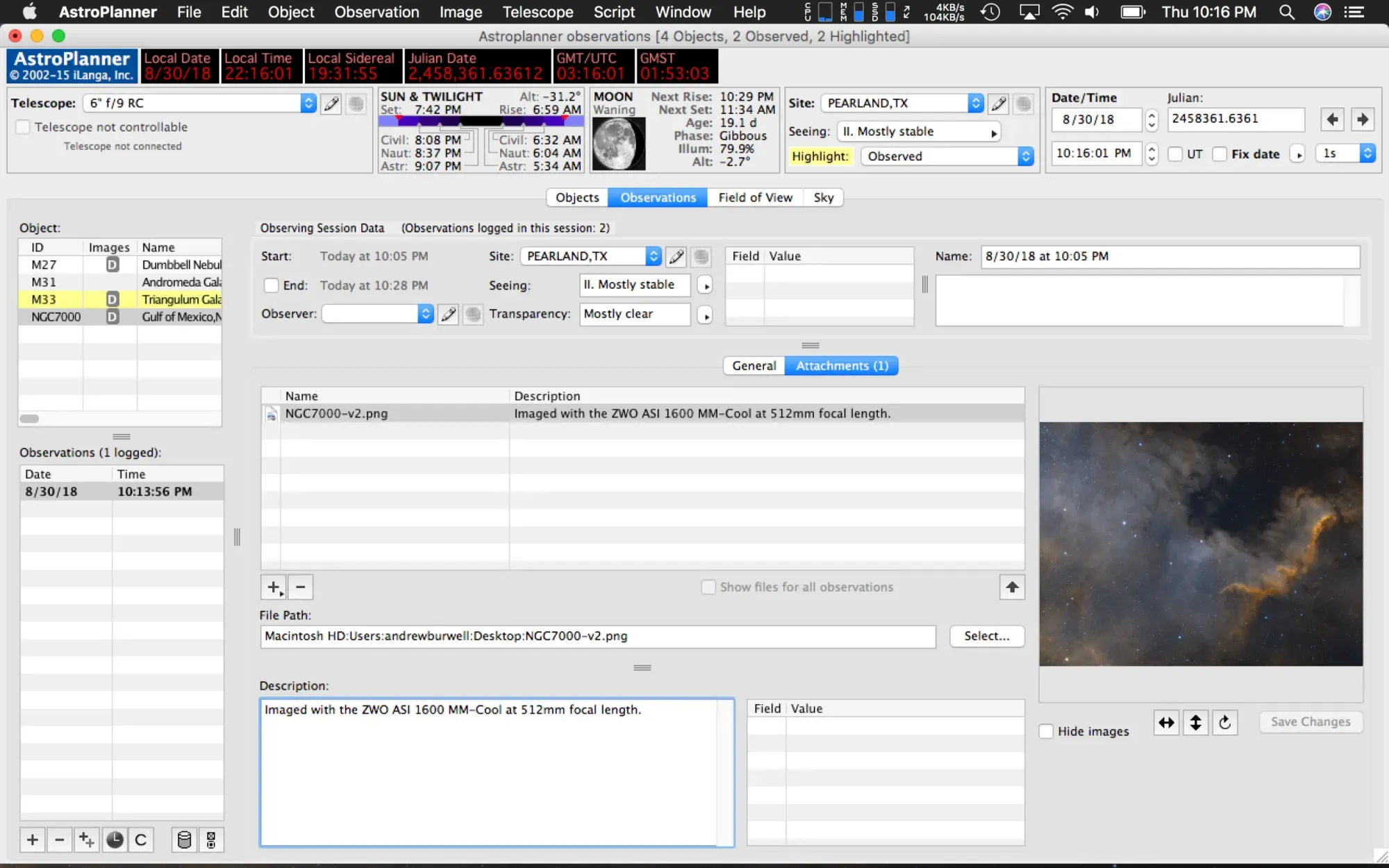 Additionally, you can add attachments to your observations. In this case, I added an image I took with my telescope of NGC7000. I left an observation note listing out the focal length and equipment I used for this session.