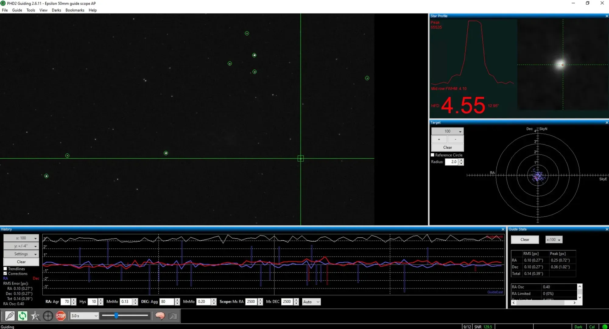 I ran a 3 point polar alignment with NINA, which got me to 1° of polar error. I probably could have tweaked it a little bit better, but thought that was good enough. Without any model, the guiding is pretty spectacular as you can see in the graph above.