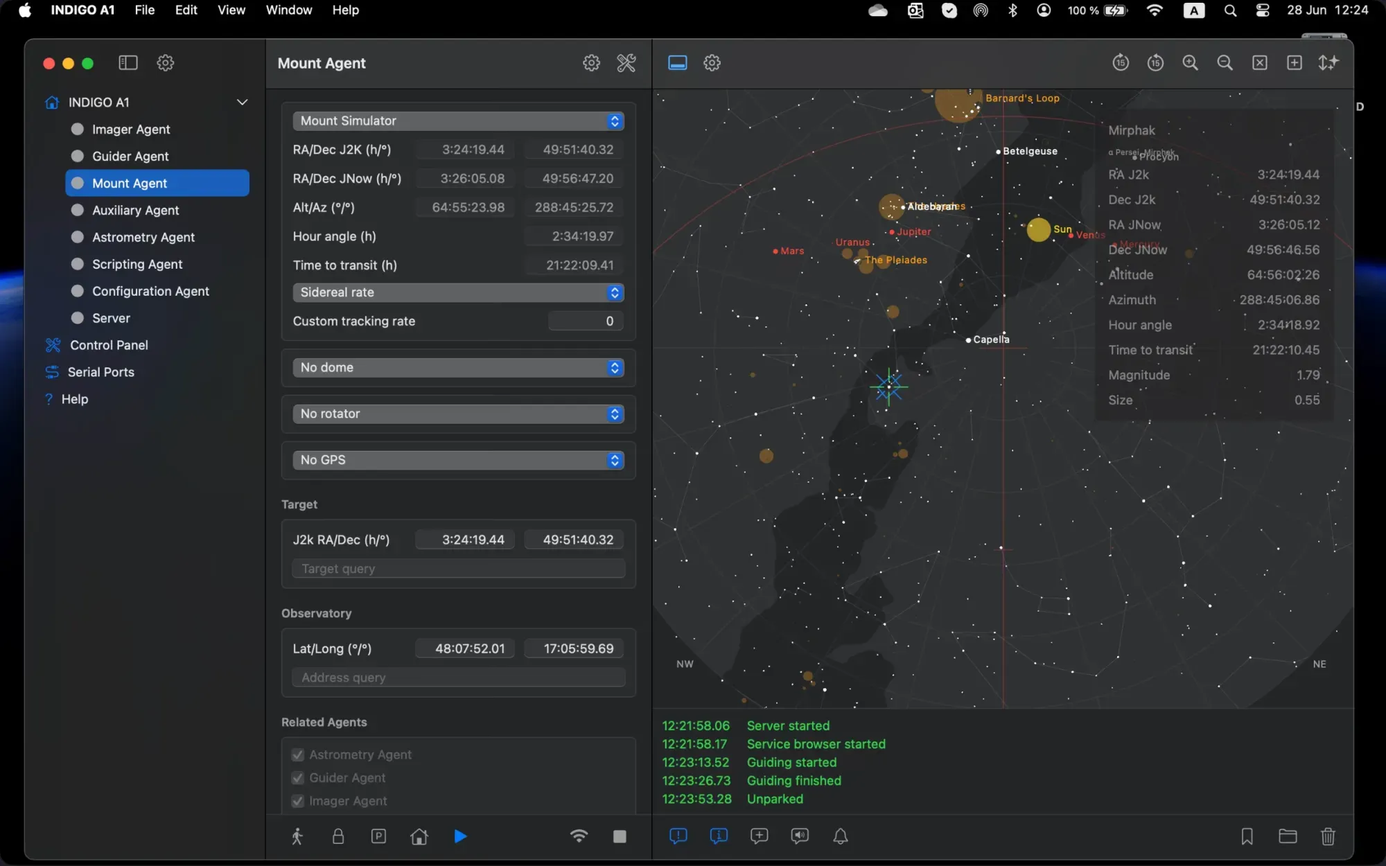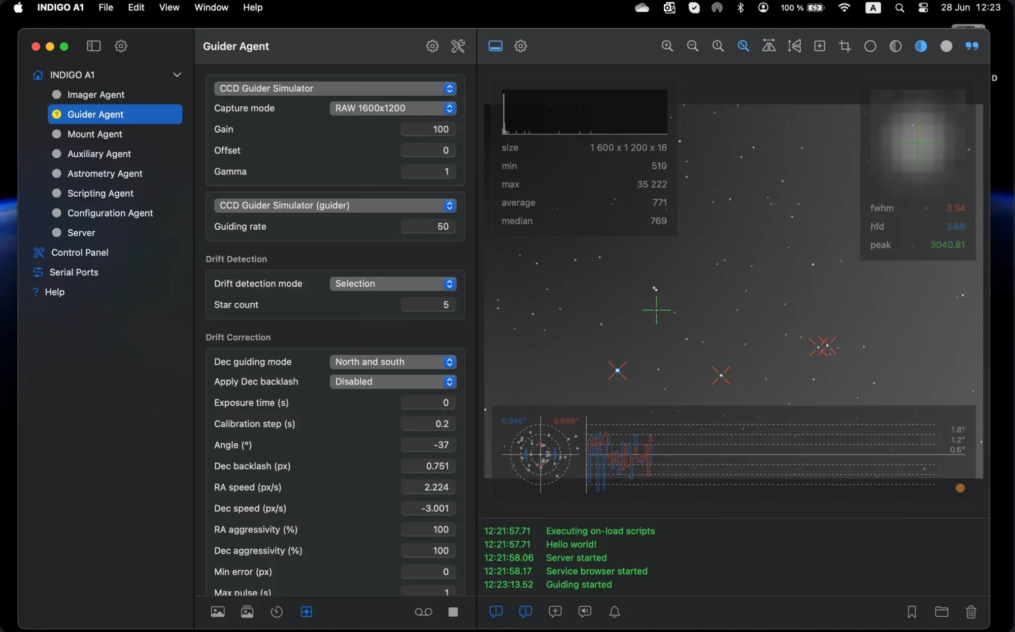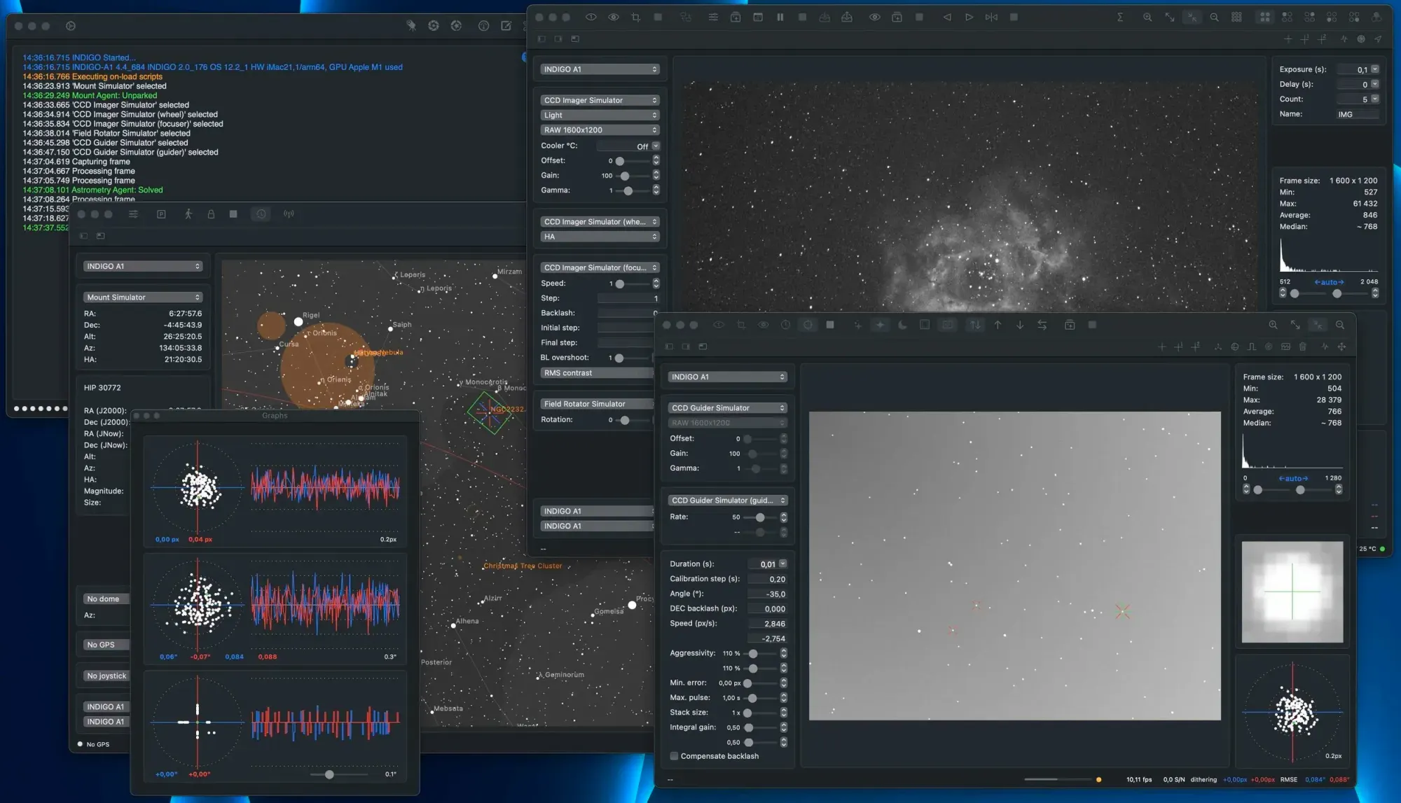 NINA doesn't include a built-in guider — it relies on PHD2, which runs as a separate application and communicates with NINA via a server connection. This works well and PHD2 is excellent, but it's another application to install, configure, and keep running. INDIGO A1 includes guiding as an integrated module (the $24.99 guider purchase). The guider agent handles calibration, multi-star detection, dithering coordination with the imager, and guiding pause during slews — all within the same application. That said, PHD2 does run on macOS, so you have the option to use it alongside INDIGO A1 if you prefer.