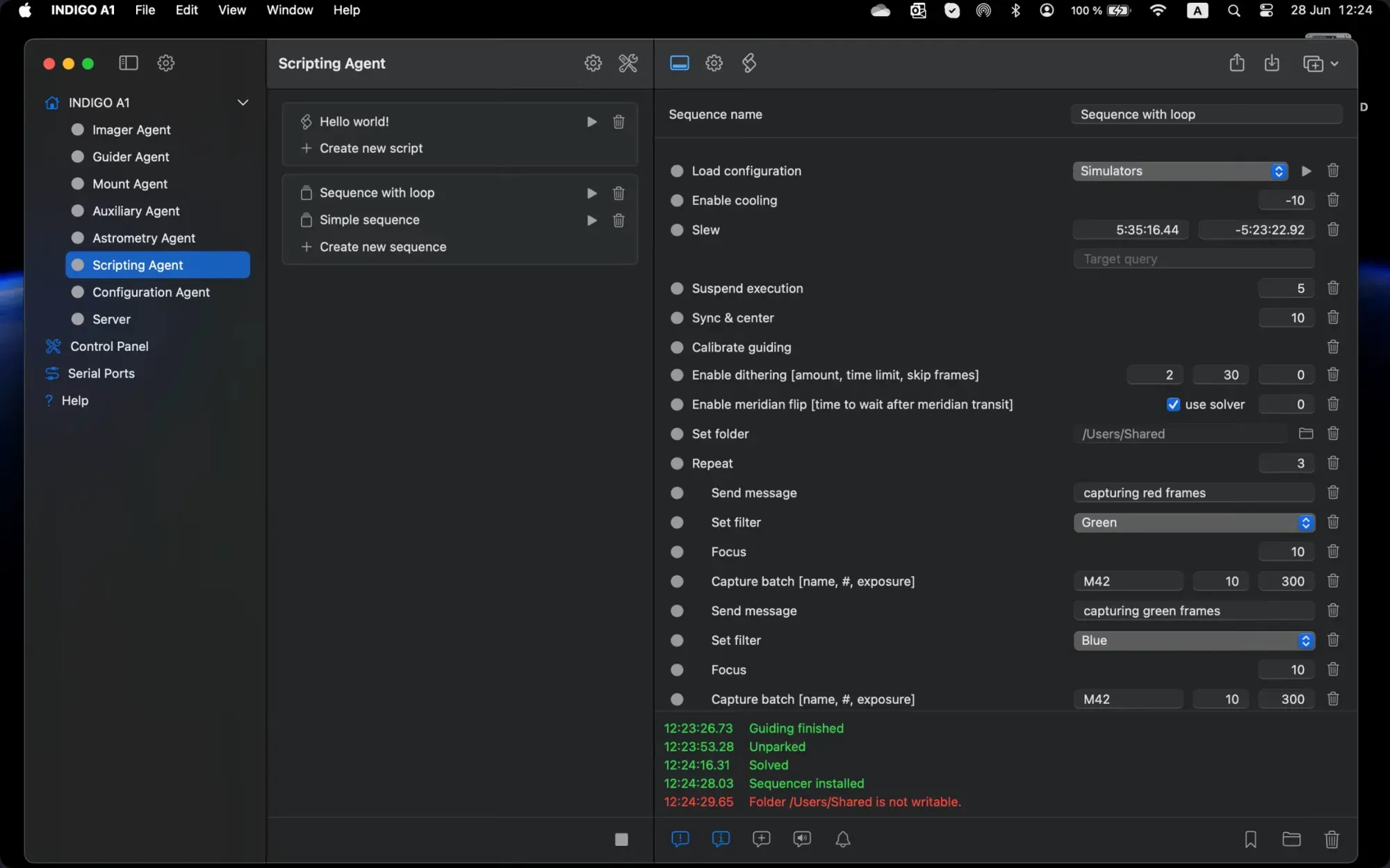 The sequencer deserves special mention. INDIGO A1 includes a scripting-capable sequencer that lets you build automated imaging plans with multiple targets, filter changes, focusing runs, and conditional logic. Recent updates have added functions like calibrate_guiding_exposure(), clear_focuser_selection(), and clear_guider_selection() to the sequencer vocabulary, giving you programmatic control over the full imaging chain. This isn't as visually drag-and-drop as NINA's advanced sequencer, but the capability is there for users willing to learn the scripting syntax.