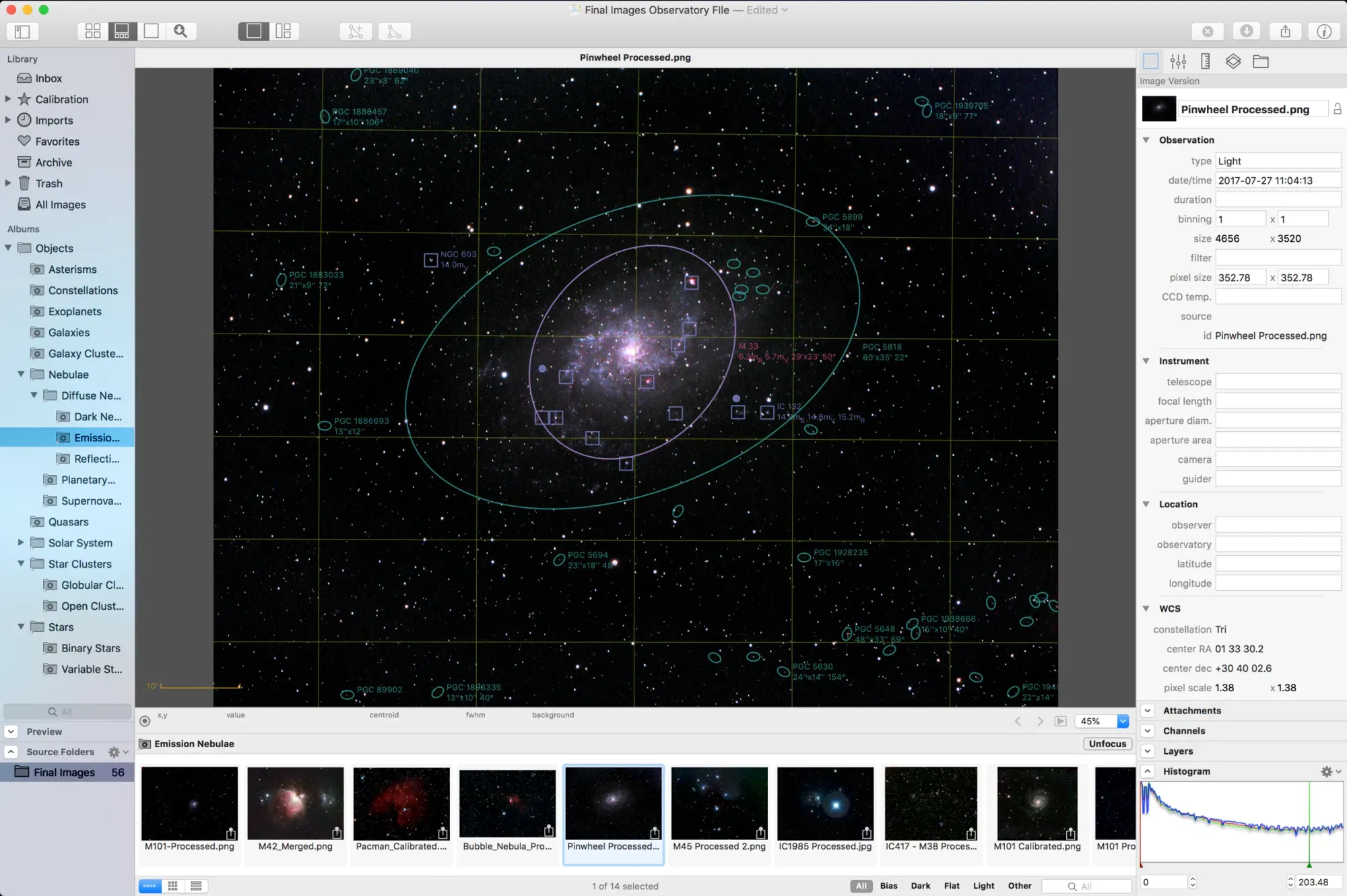 After importing your images (which is just a reference to your files on your drive, so very little additional space is required) you can plate solve the images for automatic tagging by all the known astronomical databases. The benefit of this is that any object you've purposely captured, or objects you inadvertently captured are tagged in your images. You can then create smart folders which then subdivide your set of images into nice little categories like galaxies, nebulas, planetary nebulas, etc.