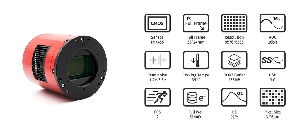 The camera also features an extremely low read noise, reducing the amount of noise or error you see in your captured images. This equates to better signal from the objects you’re imaging. Additionally the full well capacity is quite large at 51k, which means you’ll saturate stars and bright areas less quickly, allowing you to capture longer singe frames. This is helpful when each frame is so large.