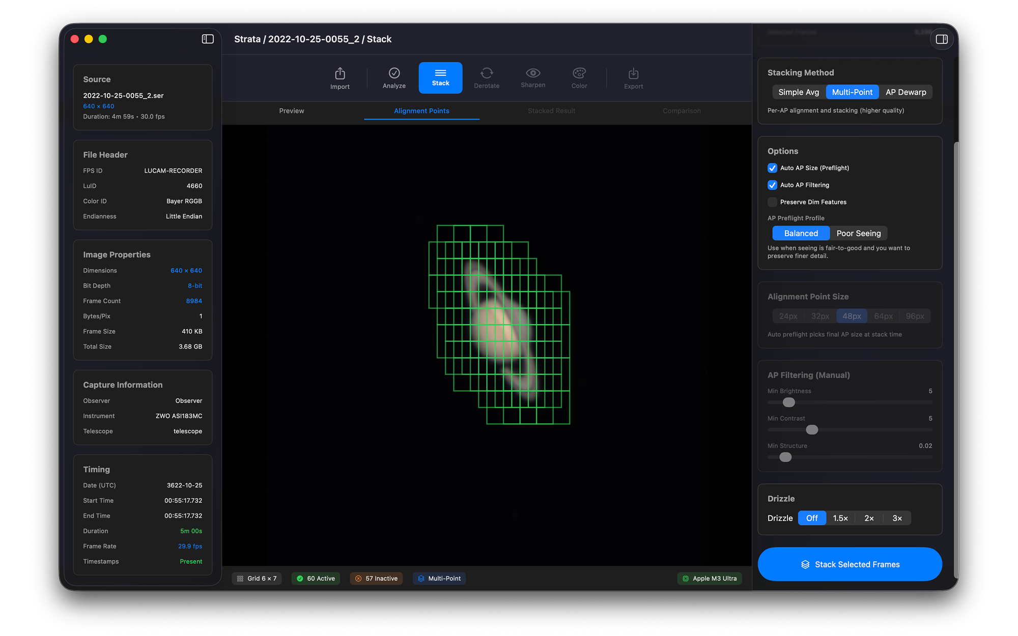 AutoStakkert is an excellent Windows stacking tool that has served the planetary imaging community well for years. Strata offers a comparable stacking engine (including multi-point alignment) but runs natively on macOS with full GPU acceleration through Metal. Key differences: real-time preview of sharpening (no separate app needed), integrated quality analysis, derotation built in, and all processing happens on the GPU — stacking is up to 93x faster than CPU on Apple Silicon. No emulation, no Wine, no Parallels required.