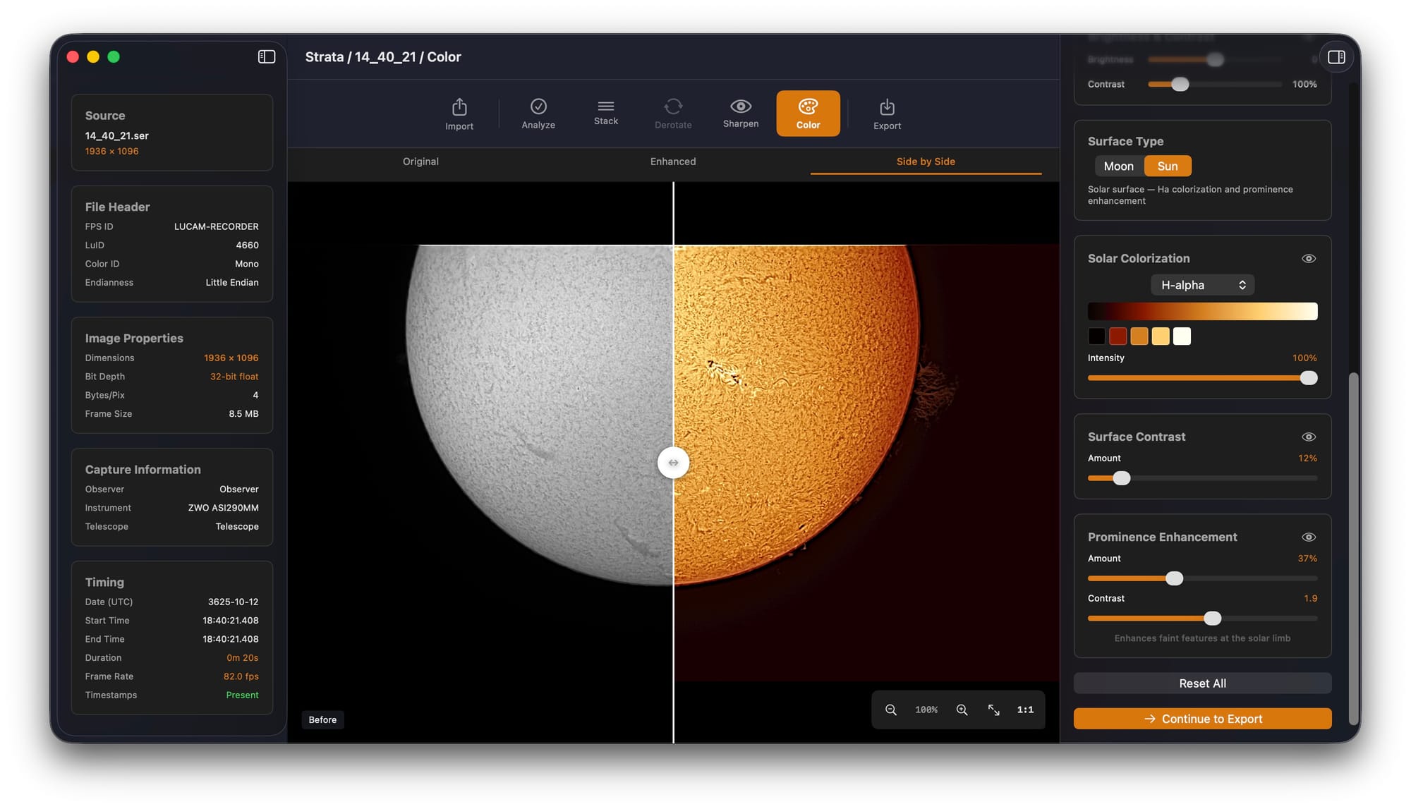 Strata is a native macOS app for planetary image processing. It replaces the traditional Windows-only workflow of AutoStakkert (stacking) + RegiStax (sharpening) + PIPP (pre-processing) in a single, GPU-accelerated application. Import a SER capture file, analyze frame quality, stack the best frames, sharpen with wavelets or deconvolution, correct color, and export — all in one window, all on the GPU.