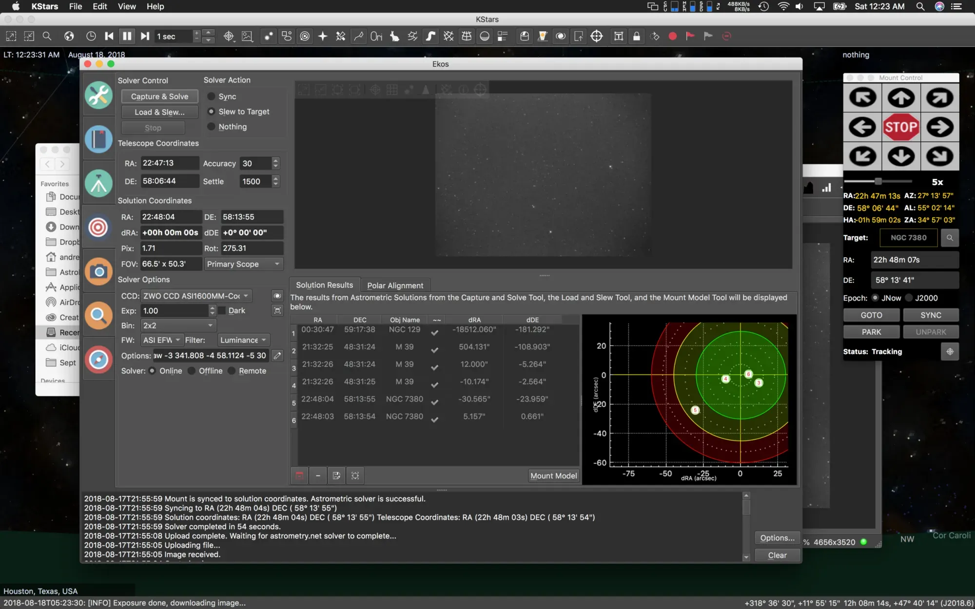 Usually what I do in this first step is select Sync under Solver Action. Then I press Capture and Solve. All I'm doing here is plate solving the current position to tell the mount exactly where it's aimed. I had told it to aim at NGC129, but after this first solve, it shows the mount is way off. Not knowing for sure if this is an adequate target, I pick a new one using the Telescope Control and aim at M39, an open cluster. I once again set it to Sync, and press Capture and Solve. Now I'm fairly close to the target, but not quite in the green area. I press goto one more time now that my mount knows where it is, and then Capture Solve/Sync one more time and see if the last slew was closer to the target. Finally, we're in the green and good to go to our final imaging target for the night. I pick the Wizard Nebula NGC7380, and press goto. Once there, I perform a Capture and Solve/Move to target. This will perform multiple Capture and Solve routines moving the mount each time getting the target lined up perfectly. Once it's good the Capture and Solve process stops. Time to turn on guiding now.