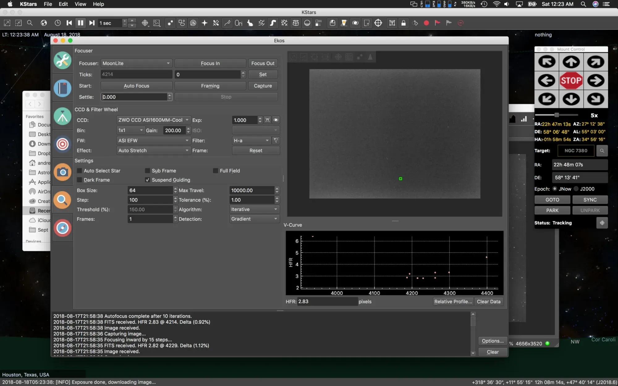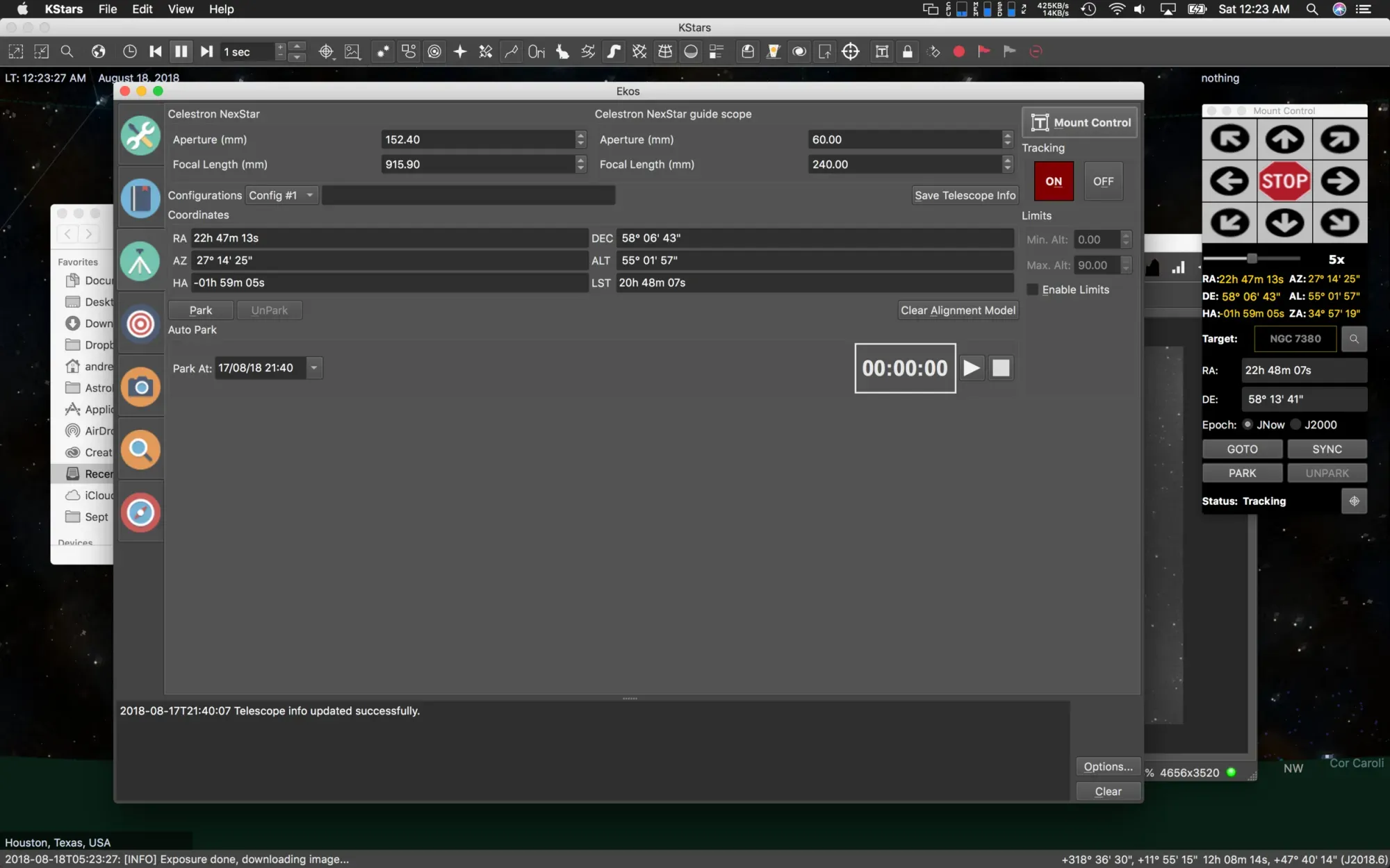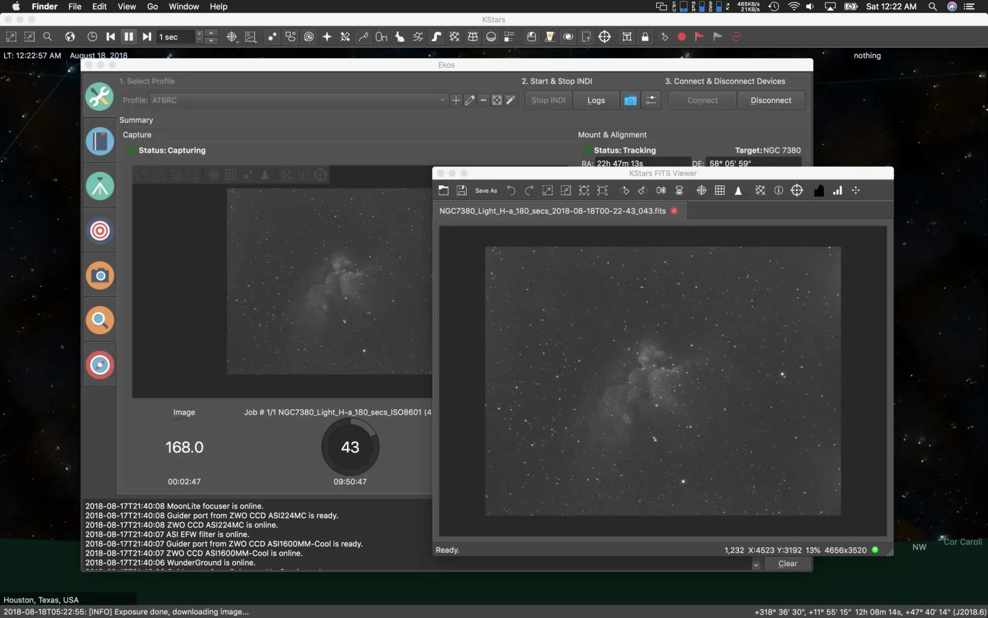 The first step in my process is to set up all my equipment, connect it to the Mac laptop and start with anAll Star Polar Alignment(I can't see Polaris, so use this method built into Celestron mounts). After this procedure is complete, I load up Kstars, then press the EKOS button on the top bar to launch the EKOS capture system. I then press the connect button to connect to my equipment which I have pre-setup within EKOS prior to this nights session.
