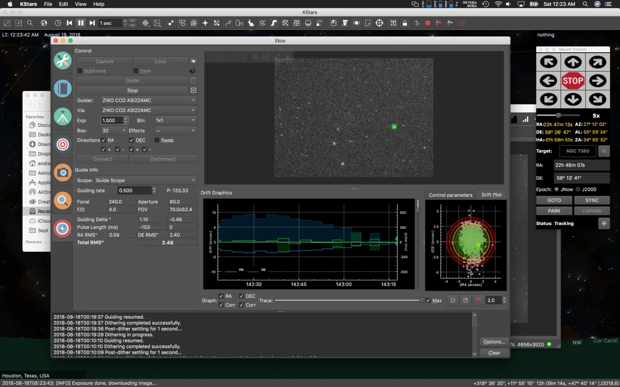 With our target picked, and GOTO plate solved to the target, we're ready to start guiding. This process is fairly straight forward. Dithering is turned on by default (you can check it by going to the options button in the lower right corner of the window). Now, we press capture, this shows you a single image from your guide cam. Select a star with your mouse, and it highlights with a green box. Press Guide, and the guiding calibration begins. This process is automatic, and you can watch the steps it's performing in the text window at the bottom of the screen. Once it's complete, guiding starts automatically. Now it's time to program our image sequence and start capturing.