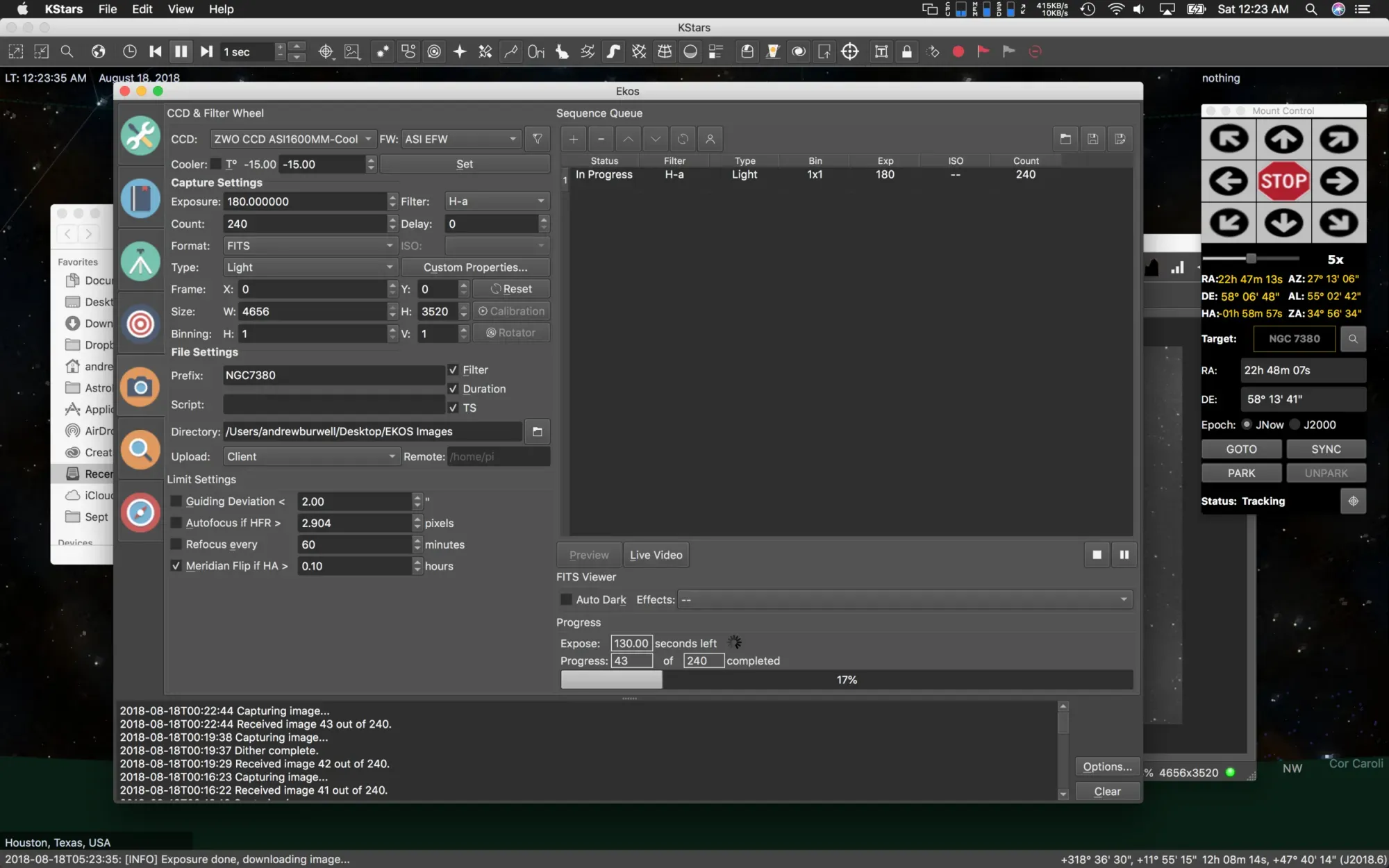 This is the final step for my process for an evening capture session. For the Wizard Nebula, I had planned on capturing it in bi-color over a two night period. Tonight is the first night, so I only plan to capture 7-8 hours of HA (Hydrogen Alpha filter), basically as long as I can before the sun comes up. Tomorrow night, I'll be capturing OIII (Oxygen III filter) for another 7-8 hours using the same routine. Since I have a cooled camera, the first thing I do here is set it's temperature to -15°C, and press the set button. The temperature quickly begins to lower. I can check that box next to the temperature, and the sequence will not start until the temperature has been reached. Next I plug in my Exposure time, I've set it to 180s, or 3 min images. A count of 240, which is more than enough to cover me to sun up. I make sure the type is set to "Light" for light frames (as opposed to dark, bias, or flat). I set the filter to H-a, then under file settings I name the files with a prefix, in this case NGC7380, and I check off Filter, Duration, and TS (Time Stamp) so that those are appended to the file names that I'm capturing.