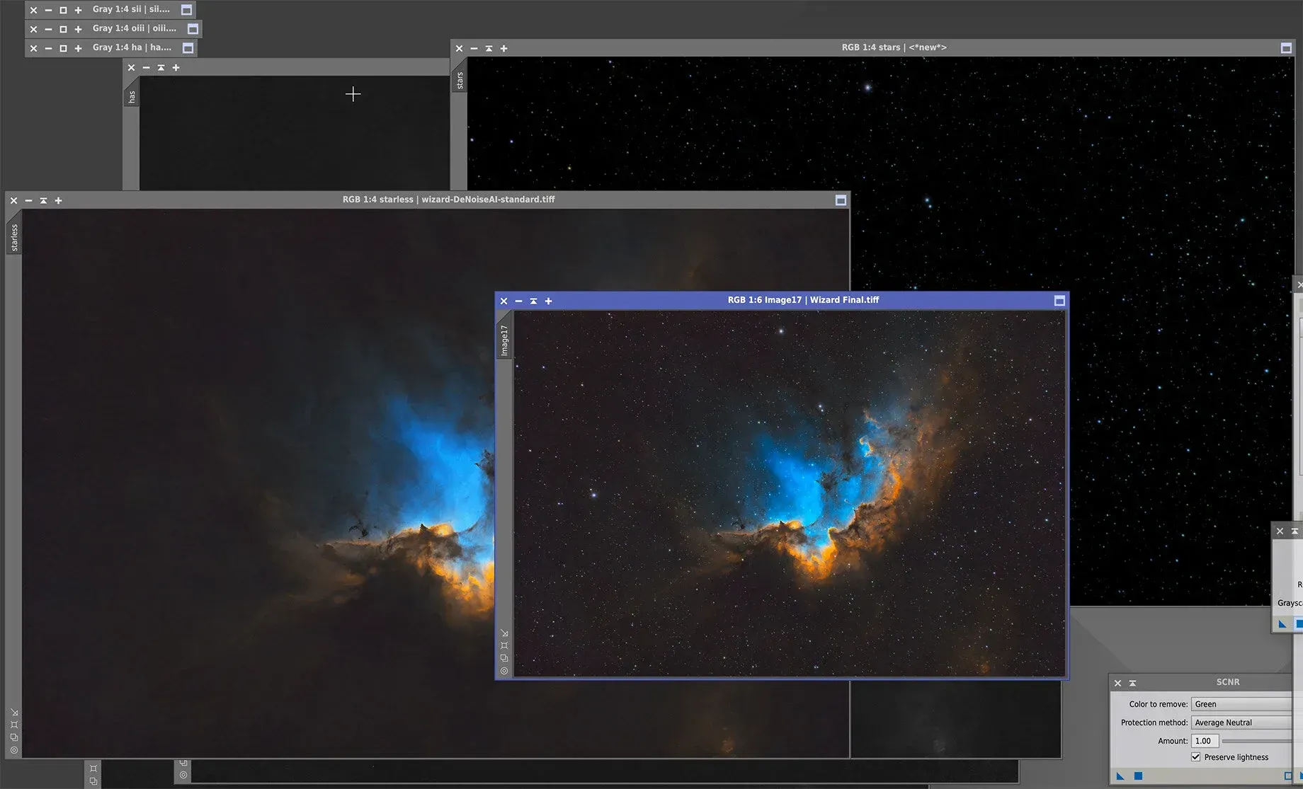 I will often on an SHO image like my Wizard and Bubble nebula process each channel separately without stars, then combine them in pixelmath like you would traditionally. Then I'll process a separate image in HSO pallet since it closer resembles RGB (HA=R, SII=G, and OIII=B). It's not quite RGB, but very close, and with some color tweaks they look just like RGB stars without having to take any RGB data. Then I'll run StarNet on that image, and take those stars, and add them into my SHO image that I processed separately.