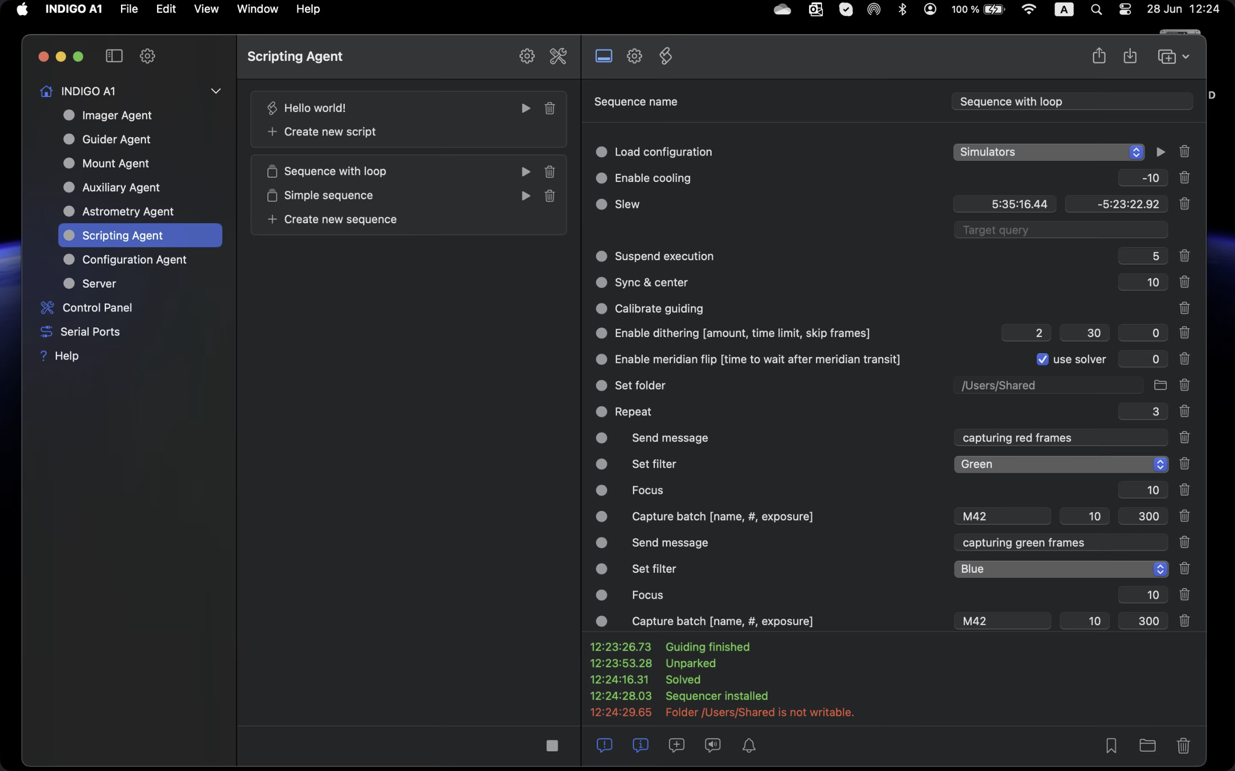 Both applications handle the core imaging workflow: camera control, batch capture, filter management, autofocus, and multi-target sequencing. NINA's Advanced Sequencer is widely regarded as one of its strongest features — a visual, drag-and-drop system with containers, triggers, conditions, and a rich plugin ecosystem that can add weather monitoring, flat panel automation, and more. INDIGO A1's sequencer is capable but more script-oriented. It handles multi-target sequences with filter changes and automation, and its ECMAScript-based scripting engine allows sophisticated custom workflows. But the learning curve for complex sequences is steeper than NINA's visual approach.