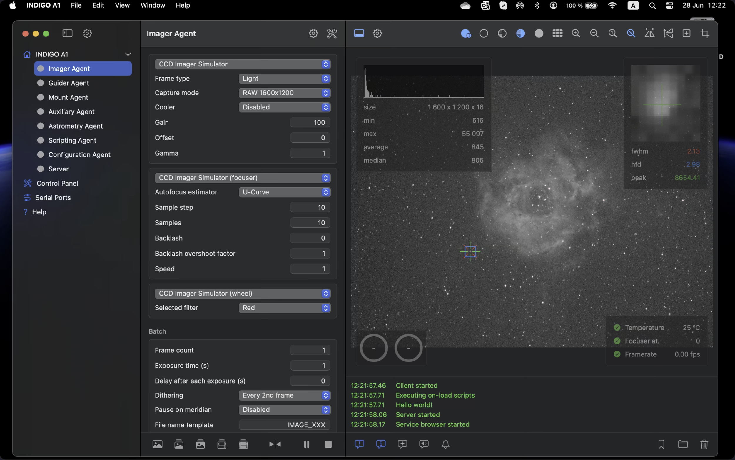 INDIGO A1 is a native macOS (and iOS/iPadOS) application that handles the entire imaging session workflow: camera control and image capture, autoguiding, telescope and mount control, focuser management, filter wheel operation, dome control, plate solving, and sequenced automation. It's built on the INDIGO framework — the modern successor to INDI that serves as the Mac and Linux equivalent of Windows' ASCOM driver standard.
