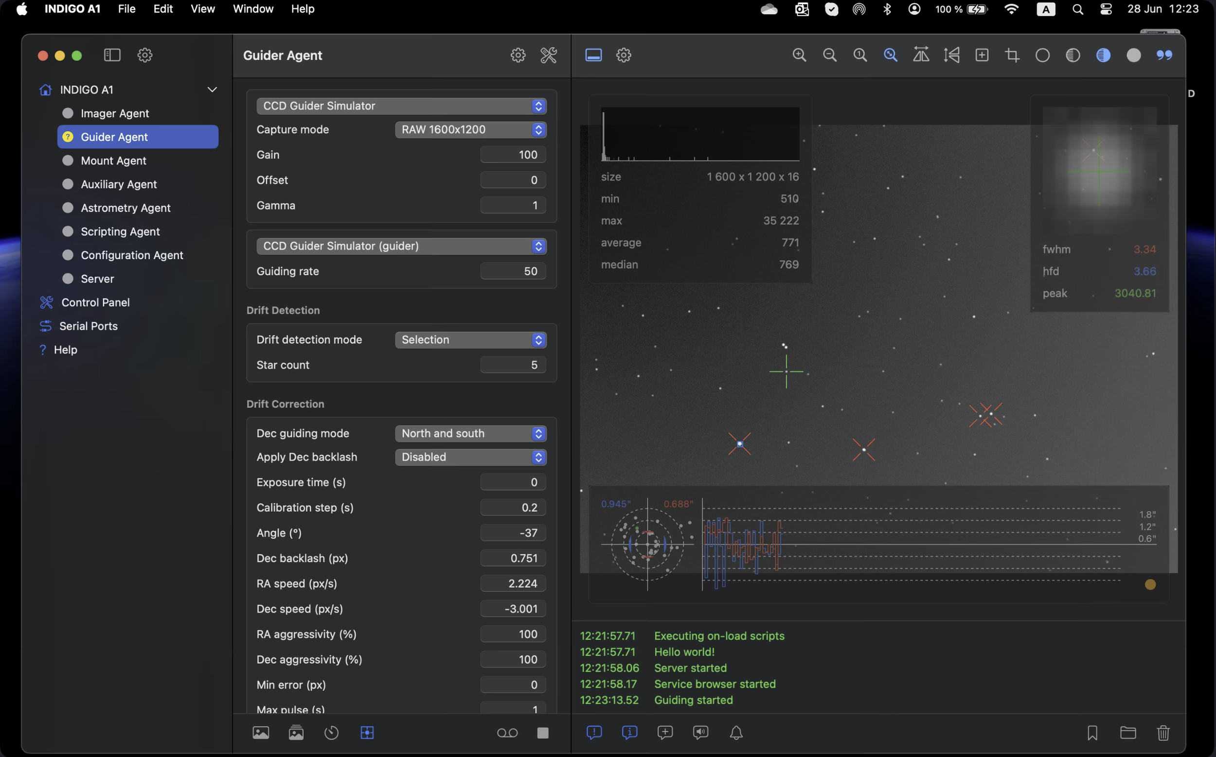 NINA doesn't include a built-in guider — it relies on PHD2, which runs as a separate application and communicates with NINA via a server connection. This works well and PHD2 is excellent, but it's another application to install, configure, and keep running. INDIGO A1 includes guiding as an integrated module (the $24.99 guider purchase). The guider agent handles calibration, multi-star detection, dithering coordination with the imager, and guiding pause during slews — all within the same application. That said, PHD2 does run on macOS, so you have the option to use it alongside INDIGO A1 if you prefer.